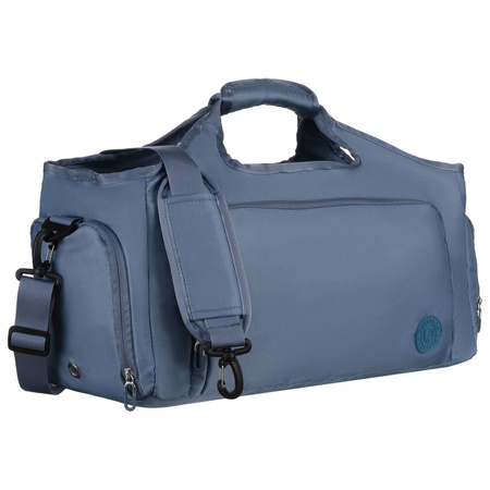 - Blaue Wochenendtasche aus strapazierfähigem Polyester. Sie verfügt über ein separates Schuhfach mit Belüftung. Die Tasche mit wasserdichtem Thermofach ist mit einem Koffergriff ausgestattet. Im Set ist ein abnehmbarer, verstellbarer Gürtel enthalten.