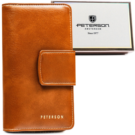 Braune, vertikale Damen-Geldbörse aus ökologischem Leder mit Druckknopf- und Reißverschluss - Peterson