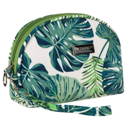- Kompakter Peterson Damen-Kosmetikbeutel mit einem Handgelenk-Gürtel, verziert mit einem modischen Monstera-Blattmuster. Der Reißverschluss sorgt für eine sichere Aufbewahrung, und die leichte Konstruktion und die praktische Form machen ihn ideal für jede