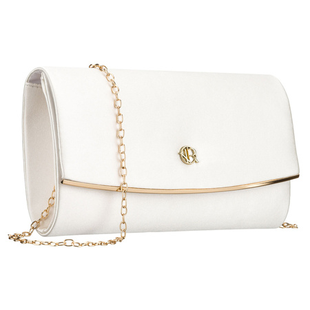 - Weiße Damen-Clutch aus synthetischem Stoff mit einer Innentasche. An einer goldenen Kette aufgehängt, die einen schmuckartigen Charakter verleiht. Ein Hauptfach, das mit einem Magnetclip verschlossen wird.