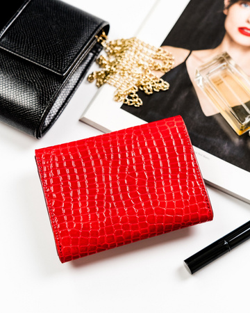 - Damen-Geldbörse mit Klappe und Druckknopfverschluss. Gefertigt aus lackiertem Naturleder mit Krokodilleder-Prägung. Innenliegend ein Bereich mit Kartenfächern und ein Fenster für den Fahrzeugschein. Geldbörse mit RFID-Stop-Schutz.