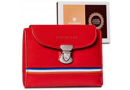 - Originelles Aussehen | Geldbörse im klassischen Stil in sinnlicher, klassischer roter Farbe. Modell in vertikaler Ausrichtung, mit einer Klappe mit Druckknopfverschluss, zusätzlich ist auf der Vorderseite der Geldbörse ein dreifarbiger, origineller Gürtel aufgenäht, der viele Blicke auf sich ziehen wird
