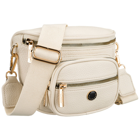 - Damen-Gürteltasche aus Öko-Leder in hellem Beigeton. Mit Reißverschluss verschließbar, ein Hauptfach mit fünf zusätzlichen Taschen, darunter eine auf der Rückseite. Getragen an einem abnehmbaren, verstellbaren Riemen.