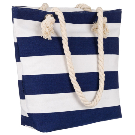 - Die von oben mit einem soliden Reißverschluss verschließbare Handtasche. Aus hochwertigem Material genäht, auf dem ein Motiv mit maritimen Streifen zu sehen ist. Leicht und geräumig, ausgestattet mit einem riesigen Hauptfach und einer kleinen Tasche.