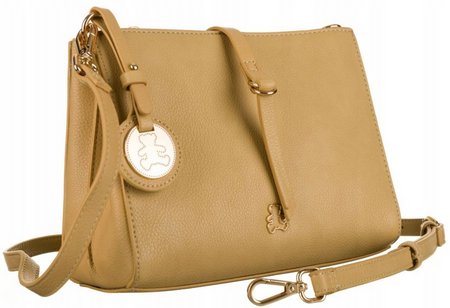 Kleine Handtasche in schlichtem Stil. Sie hat 3 Fächer, und das Innere des mittleren Fachs ist zusätzlich mit 2 Taschen ausgestattet (eine ist offen, die andere wird mit einem Reißverschluss geschlossen).