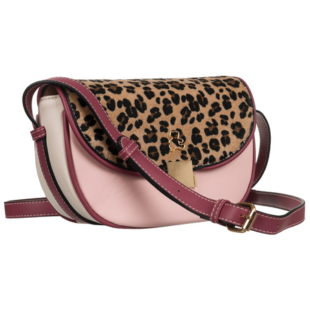 Das charakteristische Merkmal der Umhängetasche sind ihre geringen Abmessungen. Das vorgestellte Modell ist eine zweikammerige Tasche Umhängetasche mit einer Klappe mit Leopardenmuster-Klappe mit einem dekorativen Clip. Der Zugang zum Fach wird zusätzlich durch einen unter der Klappe versteckten Reißverschluss geschützt.