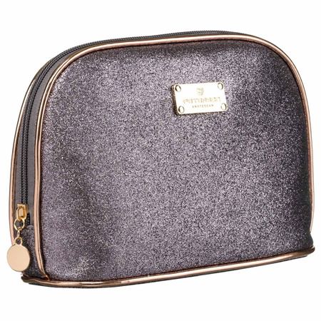 Elegante Kosmetiktasche aus glitzerndem Material in Schwarz. Die Paspelierung in Roségold unterstreicht die Farben des Materials. Der Reißverschluss ist mit einem runden Metallanhänger verziert.