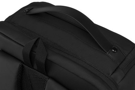 - Rucksack aus wasserdichtem Polyester. Er verfügt über 2 Fächer und 5 Außentaschen. An der Außentasche des Rucksacks befinden sich 2 Anschlüsse: ein USB-Anschluss und ein USB-Typ-C-Anschluss. Dieses Modell verwendet längenverstellbare Schultergurte und ein