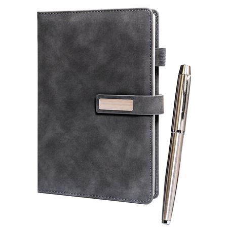 Stilvoll, minimalistisch und gleichzeitig raffiniert – dieses Set ist eine Kombination aus Eleganz und Funktionalität. Es besteht aus einem dunkelgrauen Notizbuch mit Magnetverschluss und einem hochwertigen silbernen Kugelschreiber. Das Ganze ist in einer exklusiven Firmenbox verpackt. Es ist die ideale Wahl als Geschenk für Liebhaber von gutem Design und perfektem Stil – sowohl für das Büro als auch für den Alltag.