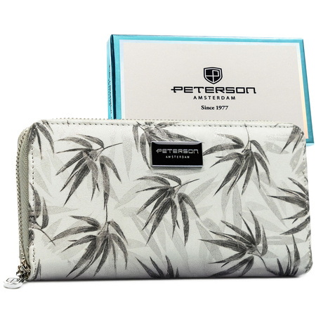Graue Damen-Geldbörse im Federmäppchen-Stil mit Pflanzenmuster, hergestellt aus Natur- und Öko-Leder - Peterson