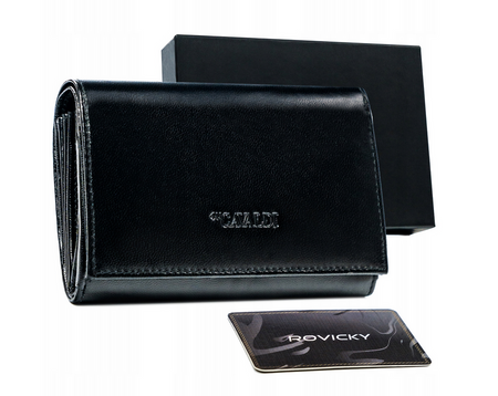 - 6 Fächer für Dokumente in einem größeren Format, wie z. B. ein Fahrzeugschein in einer Hülle. Eines dieser Fächer befindet sich auf der Außenseite, auf der Rückseite der Geldbörse und ist mit einem Reißverschluss verschlossen;