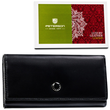 - Elegante, schwarze Damen-Geldbörse Peterson mit großem Fassungsvermögen. Hergestellt aus hochwertigem Naturleder. Verfügt über zahlreiche Fächer für Banknoten und Münzen. Keine speziellen Kartenfächer. Zusätzlicher RFID-Schutz schützt vor Skimming.