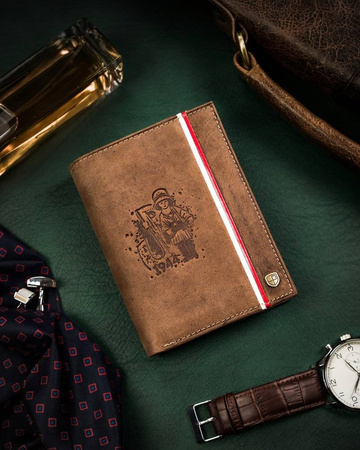 - Patriotisches Accessoire | Geldbörse im klassischen Stil. Modell in vertikaler Ausrichtung ohne äußeren Verschluss. Auf der Vorderseite befindet sich ein geprägtes Motiv, das einen kleinen Aufständischen und das Zeichen des kämpfenden Polens darstellt;