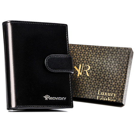 - Klassisches Design | Vertikales Modell mit Druckknopfverschluss. Klassische schwarze Farbe mit dezentem Rovicky®-Logo und silbernen Beschlägen;
