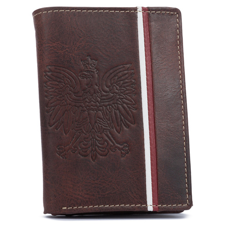 - Herren-Geldbörse aus echtem Nubukleder. Ein geprägter Adler und eine weiß-rote Flagge auf der Vorderseite der Geldbörse verleihen ihr ein elegantes, patriotisches Aussehen. Modell mit vertikaler Ausrichtung. Die im Portemonnaie befindliche RFID-Einlage sc