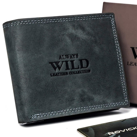 - Mittelgroße, horizontale Leder-Herren-Geldbörse. Das Modell der Marke Always Wild ist mit 4 Kartenfächern, 3 Dokumentenfächern und einem doppelten Geldscheinfach ausgestattet. Die Geldbörse verfügt über eine eingenähte RFID-Stop-Membran, die vor Skimming