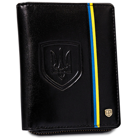 - Kompakte Herren-Geldbörse mit Reißverschluss. Hergestellt aus hochwertigem Naturleder. Auf der Vorderseite Farben und Wappen der Ukraine. Geldbörse mit praktischem Fach auf der Rückseite – ideal für das am häufigsten verwendete Dokument.