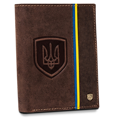 - Gefertigt aus hochwertigem Naturleder. Herren-Geldbörse im klassischen Stil. Modell in vertikaler Ausrichtung ohne äußeren Verschluss. Auf der Vorderseite befindet sich ein Motiv der blau-gelben Flagge sowie das Bild des ukrainischen Wappens. Ausgestattet