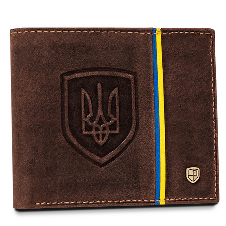 - Fest vernäht aus hochwertigem Nubuk-Naturleder. Modell im Querformat ohne Außenverschluss. Auf der Vorderseite befindet sich ein zartes Motiv der blau-gelben Flagge und das Bild des ukrainischen Wappens. Ausgestattet mit RFID BLOCKING SYSTEM Technologie.