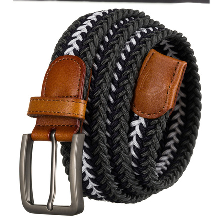 Der Gürtel zeichnet sich durch ein effektives, geflochtenes Muster aus, das drei Farben kombiniert: Grau, Schwarz und Weiß.