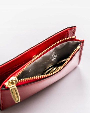 • 1 Fach mit Reißverschluss. Dieses Fach ist ein separater Bereich der Geldbörse.