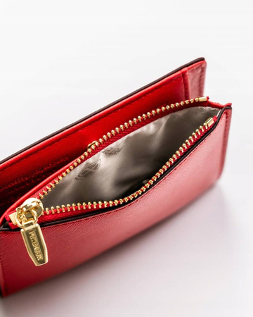 Die Geldbörse ist sehr langlebig aus hochwertigem ökologischem Leder gefertigt. Das Material ist sehr angenehm im Griff und ähnelt täuschend echtem Rindsleder. Ein relativ kleines Modell - ideal für kleine Handtaschen. Zeitloses Design, ergänzt durch goldene Beschläge. Ein horizontales Modell, das mit einem Druckknopf geschlossen wird. Die Vorderseite ist mit einem goldenen Markenlogo verziert.