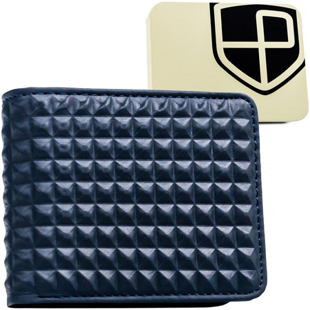 - Marineblaue Herren-Geldbörse mit einem stilvollen, geometrischen 3D-Muster. Sie verfügt über 9 praktische Kartenfächer und 4 Staufächer für Dokumente für eine optimale Organisation. Ausgestattet mit einem RFID-System. Verpackt in einer eleganten Schachtel