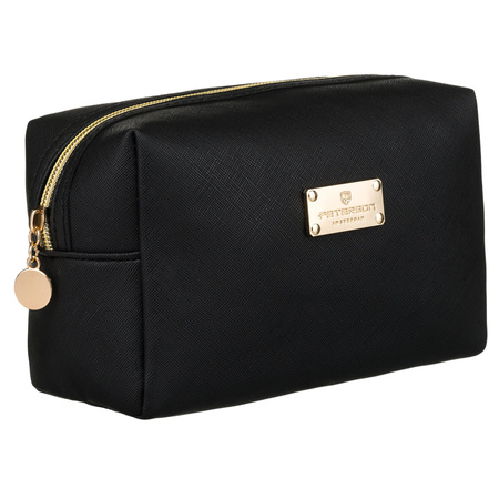 Stilvoller Kosmetikbeutel aus schwarzem Material mit einer Saffiano-Textur, die sich durch ein feines, kreuzförmiges Muster auf der Oberfläche auszeichnet. Diese Art von Textur verleiht dem Material ein elegantes und raffiniertes Aussehen und bietet gleichzeitig eine höhere Beständigkeit gegen Kratzer und mechanische Beschädigungen. Der Reißverschluss und der runde Anhänger in Gold verleihen dem Produkt einen exklusiven Charakter.