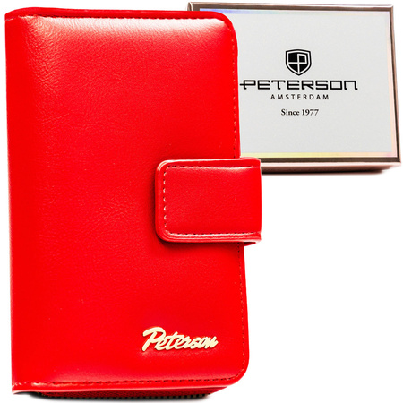 - Öko-Leder Herren-Geldbörse in Rot. Sie passt in eine Handtasche oder Hosentasche und bietet gleichzeitig viel Platz für Karten, Dokumente, Banknoten und Münzen. Die Geldbörse wird mit einer Peterson-Markenbox geliefert. Das Modell bietet Platz für den Fah